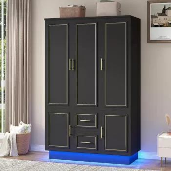 75" Modern Armoire Closet with LED Lights, 2 Drawers, Shelves & Hanging Rod