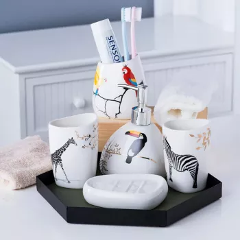 Cute Zebra & Parrot Ceramic Bathroom Accessories Set for Kids – 5-Piece Wash Set