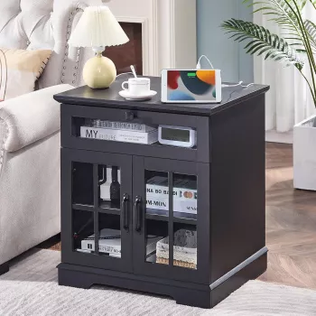 Farmhouse Bedside Table with Charging Station and Barn Door Storage – 24"