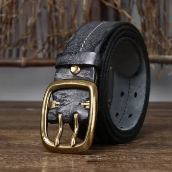 Men’s Genuine Leather Belt with Brass Double Pin Buckle – 1.5 Inch Retro Style