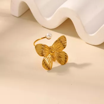 Vintage Pearl Butterfly Ring for Women – 18K Gold Plated Stainless Steel Wedding Band